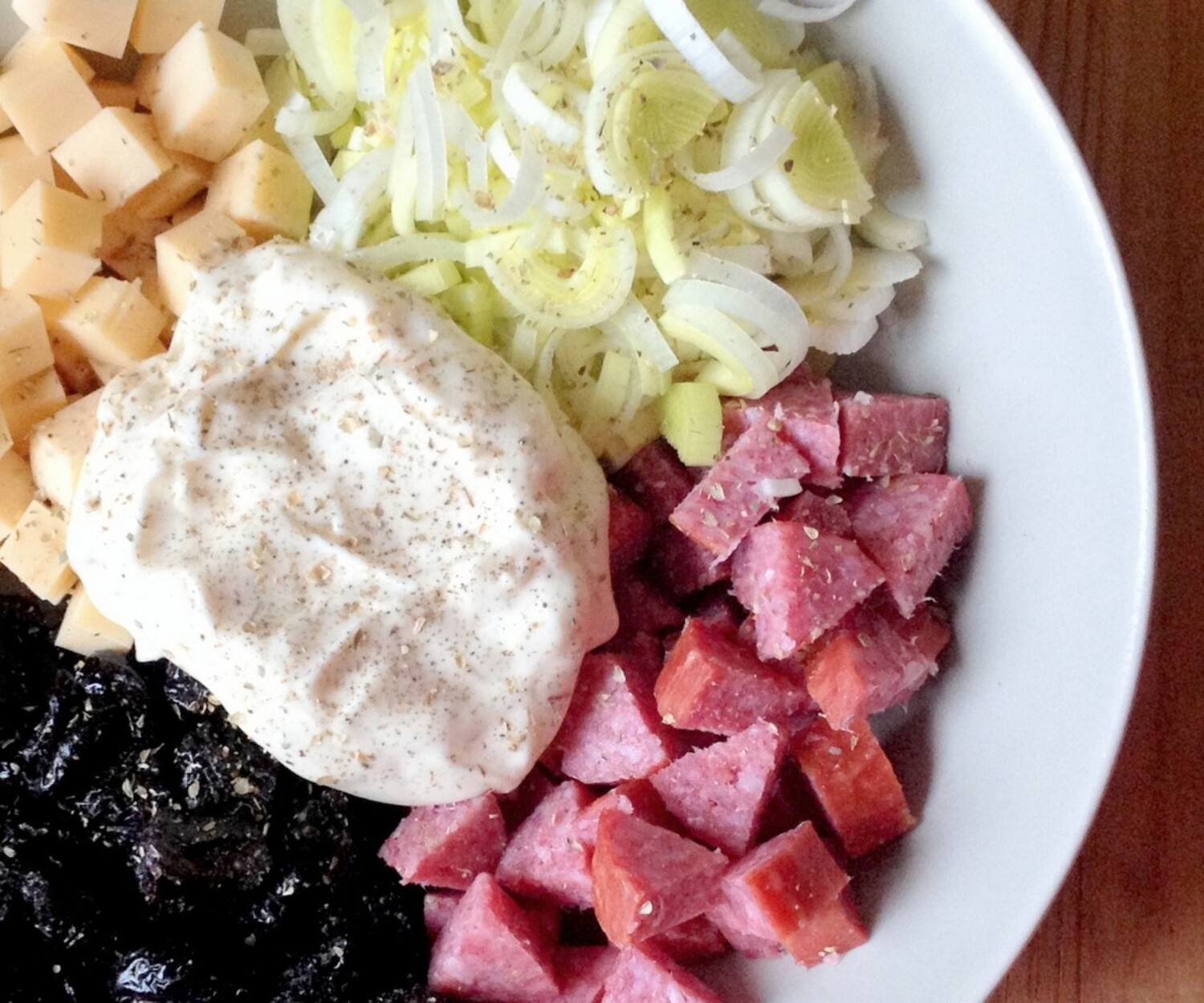 Słone 11 sty 2015 Sałatka instruktora Składniki: salami (w kawałku) ser żółty (w kawałku) suszone śliwki por majonez pieprz oregano Przygotowanie: proporcje składników –… Sandra Frej